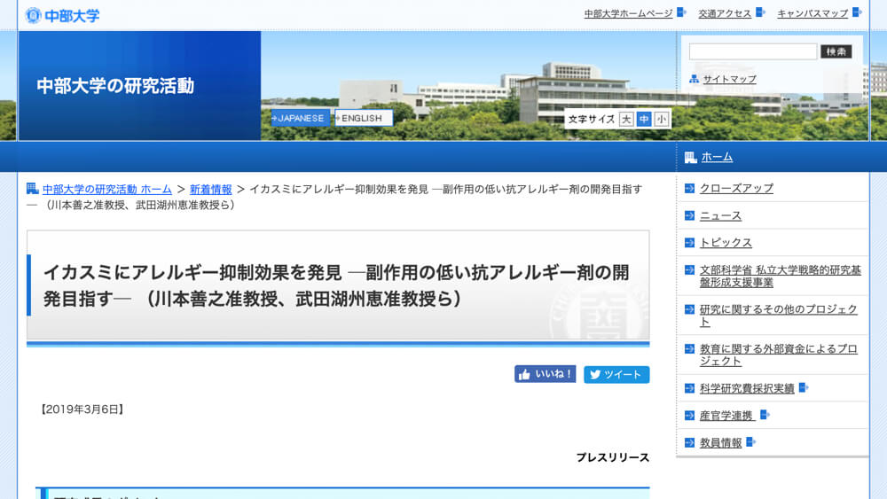 中部大学の研究活動 | イカスミにアレルギー抑制効果を発見 ─副作用の低い抗アレルギー剤の開発目指す─