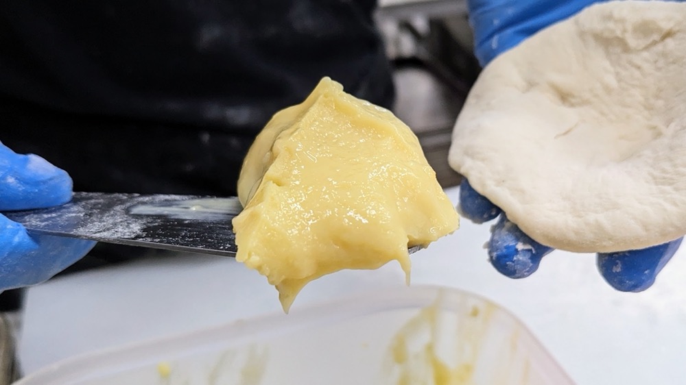 ああでもないこうでもないと研究を重ね、ついに卵乳不使用のカスタードクリームが完成しました。